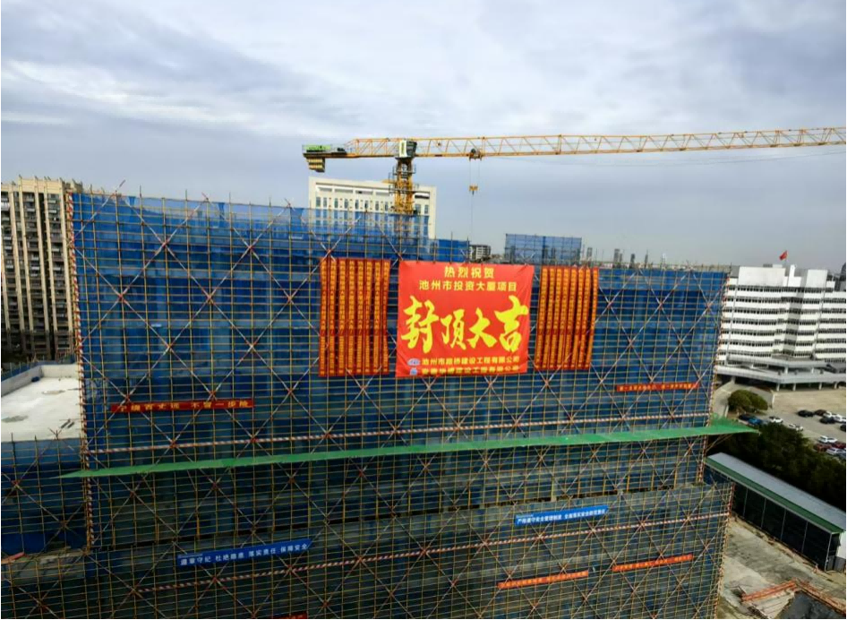 萬丈高樓平地起,一磚一瓦見匠心。從一片黃土到喜封金頂,歷經(jīng)10個月的精雕細(xì)琢,集團所屬路橋公司自籌自建的池州市投資大廈項目迎來新節(jié)點——主體結(jié)構(gòu)順利封頂,現(xiàn)已全面進入砌筑工程及裝飾裝修施工階段。