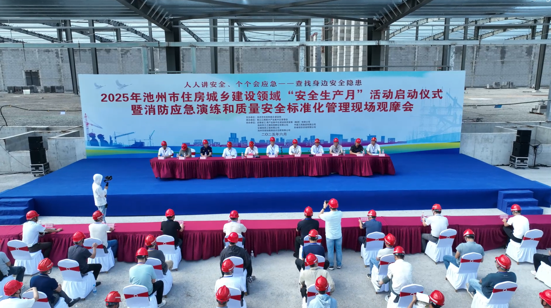 近日,《2025年池州市住房城鄉(xiāng)建設(shè)領(lǐng)域“安全生產(chǎn)月”活動啟動儀式暨消防應(yīng)急演練和質(zhì)量安全標(biāo)準(zhǔn)化管理現(xiàn)場觀摩會》在集團(tuán)所屬地質(zhì)公司承建的“京東云倉EPC項目”現(xiàn)場隆重舉行。副市長胡軍保、集中區(qū)管委會副主任張平、市住建局局長付四九及三縣一區(qū)住建安全部門和企業(yè)代表共同參與此次活動。