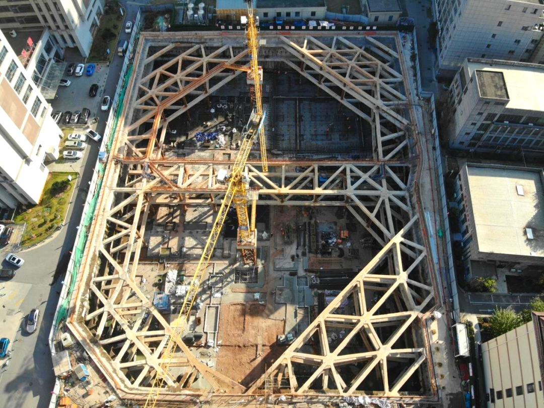 創(chuàng)新采用“旋挖樁+三層混凝土內(nèi)支撐”的復合支護體系?;悠矫娉叽邕_105.2米×81.9米,深度13.3—15.05米,設置支護樁279根、鋼立柱54根及三層混凝土內(nèi)支撐。針對雜填土區(qū)域富含地下水的情況,項目在支護樁間增設214根高壓旋噴樁,構筑起一道可靠的截水帷幕,有效防止了基坑邊水土流失,保障了基坑穩(wěn)定與周邊建筑物安全。