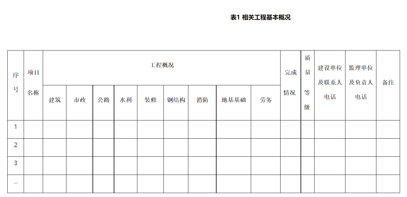 3、各公司根據(jù)本企業(yè)的資質(zhì)范圍,分別填報(bào)相應(yīng)的業(yè)績(jī)材料(如房屋建筑、市政工程、公路橋梁工程、水利(電)工程、地基及基礎(chǔ)處理工程等)。(見表1)