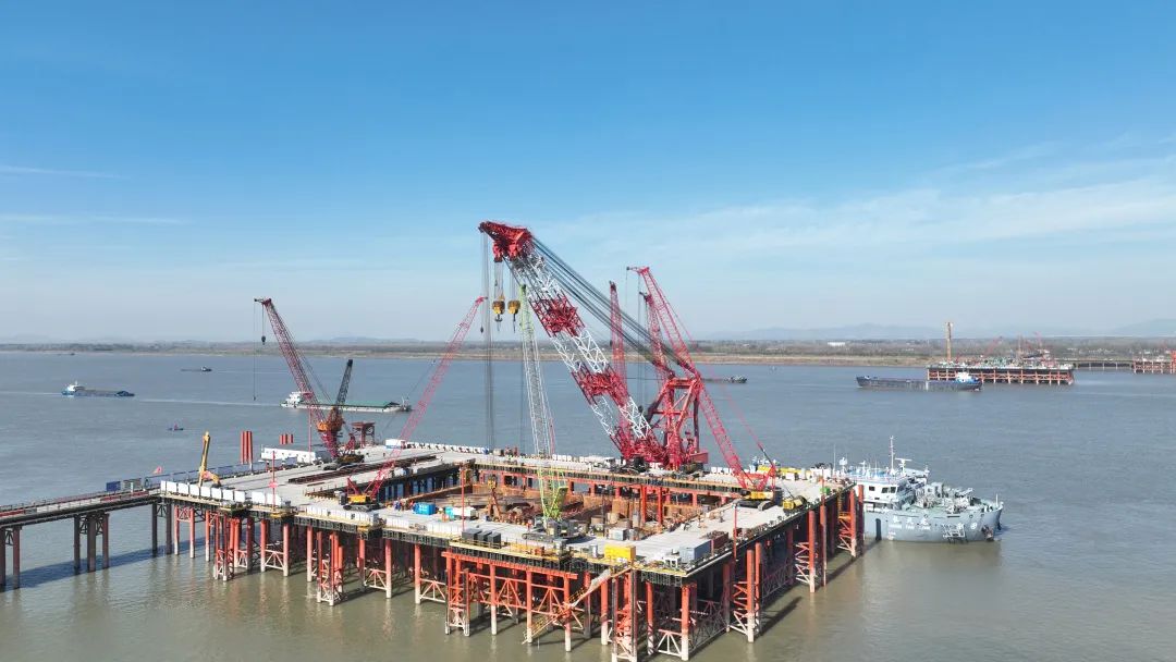 12月26日下午,在長江池州段離南岸大堤約380米處的江中施工點,隨著池州長江公鐵大橋4號墩圍堰內(nèi)最后一方封底混凝土的灌入,由集團承建的池州長江公鐵大橋4號主墩圍堰封底順利完成,標志著池州長江公鐵大橋即將進入主墩承臺施工階段,為池州長江公鐵大橋主塔施工打下堅實基礎。