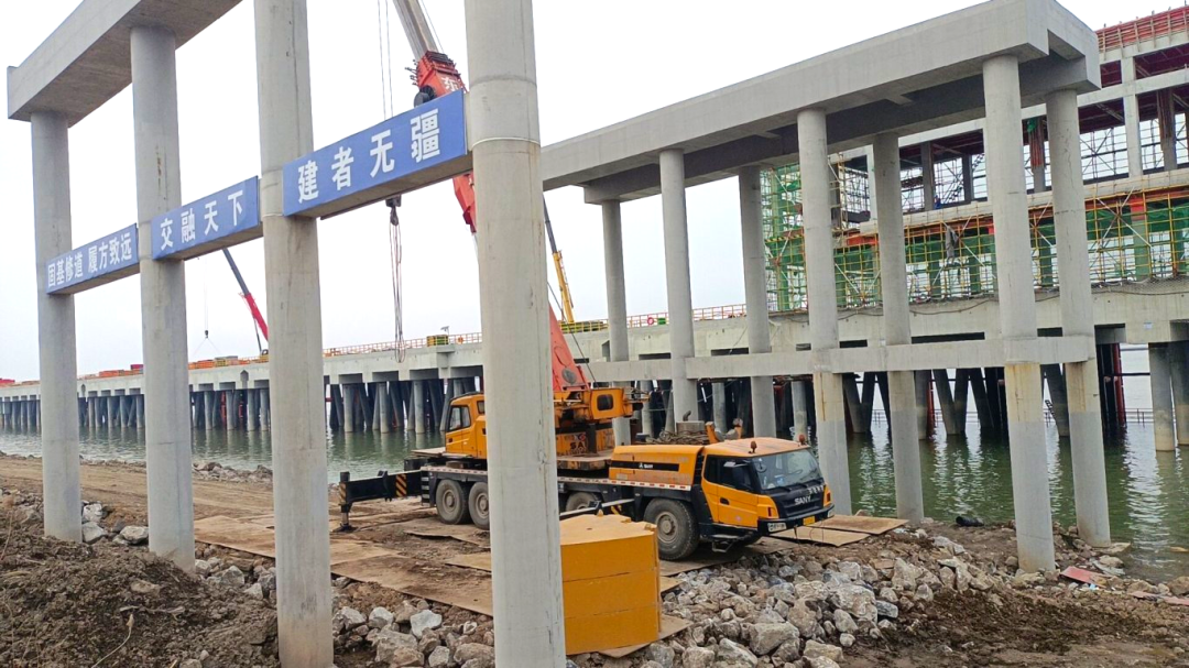 截至目前,項(xiàng)目水域部分碼頭平臺(tái)面層、兩座汽車(chē)引橋已全部澆筑完成,項(xiàng)目整體進(jìn)度已完成約83%,碼頭工程主體結(jié)構(gòu)與房建工程主體結(jié)構(gòu)已全部施工完成,正在進(jìn)行碼頭前沿鋼結(jié)構(gòu)安裝、裝船機(jī)焊接打磨進(jìn)行拼焊、房建工程進(jìn)行內(nèi)部砌墻、鋼引橋吊裝、水域部分進(jìn)行系纜欄桿安裝、橡膠護(hù)舷安裝、鋼軌安裝。碼頭陸域部分已進(jìn)場(chǎng)工作,臨時(shí)道路及部分場(chǎng)地硬化已完成,正在進(jìn)行B2轉(zhuǎn)運(yùn)樓及管理用房區(qū)域內(nèi)基礎(chǔ)施工,水泥攪拌樁已開(kāi)展工作。