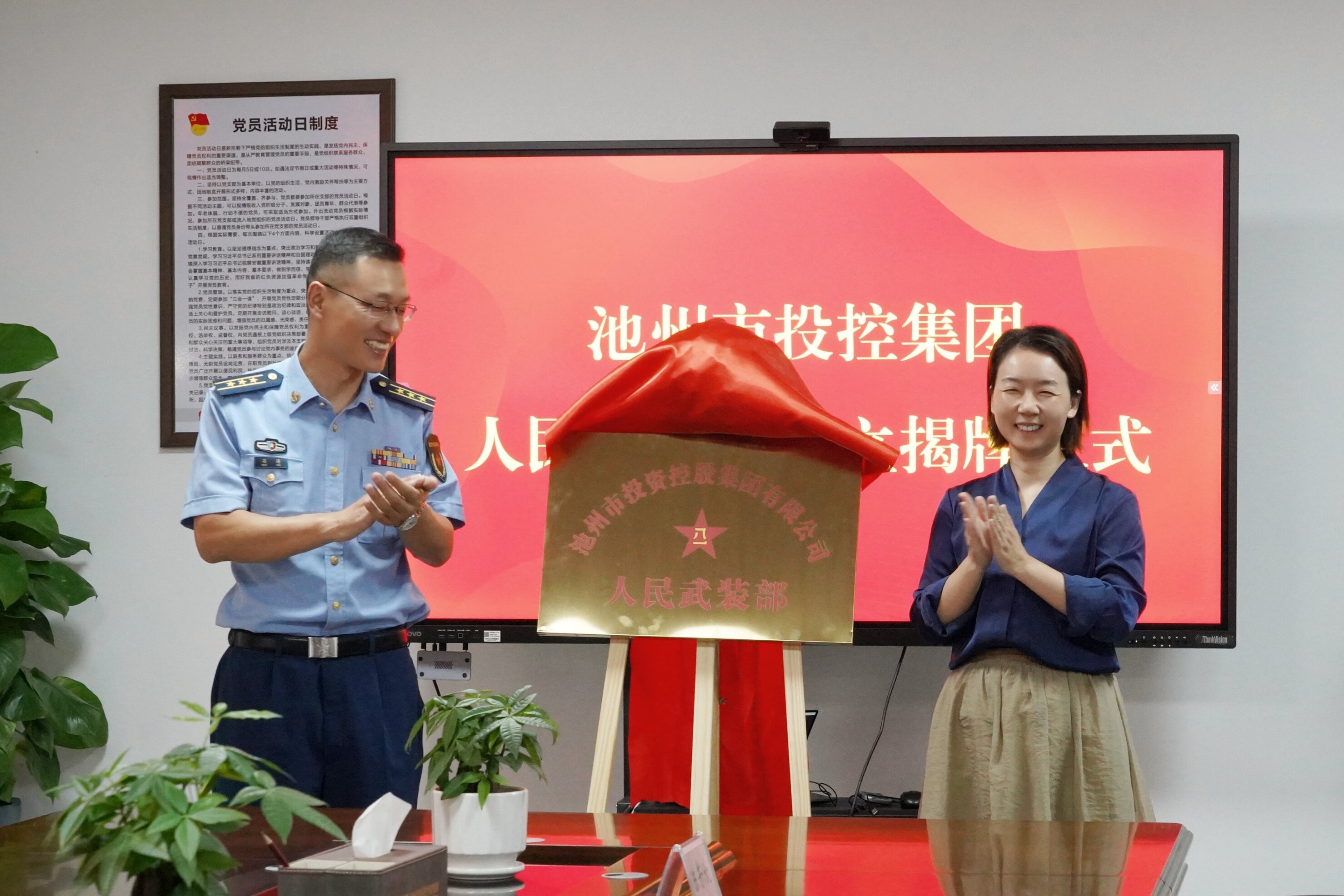 7月31日上午,池州市投資控股集團(tuán)有限公司舉行人民武裝部成立揭牌儀式,貴池區(qū)委常委、區(qū)人武部政委馮濤與集團(tuán)黨委副書記、工會(huì)主席嚴(yán)艷共同為集團(tuán)人民武裝部揭牌。集團(tuán)總經(jīng)理助理、黨群工作部經(jīng)理汪興安等參加活動(dòng)。